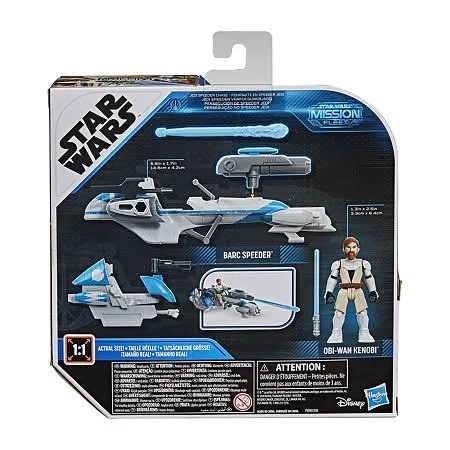 Obi-Wan Kenobi Jedi Knight Speeder Bike (also known as the BARC Speeder) is also from the Clone Wars and its what you see this CGI version Obi-Wan racing around in. Obi-Wan has a lightsaber, the vehicle has a side companion seat and repeating fireable cannon. It's perfect for play.
