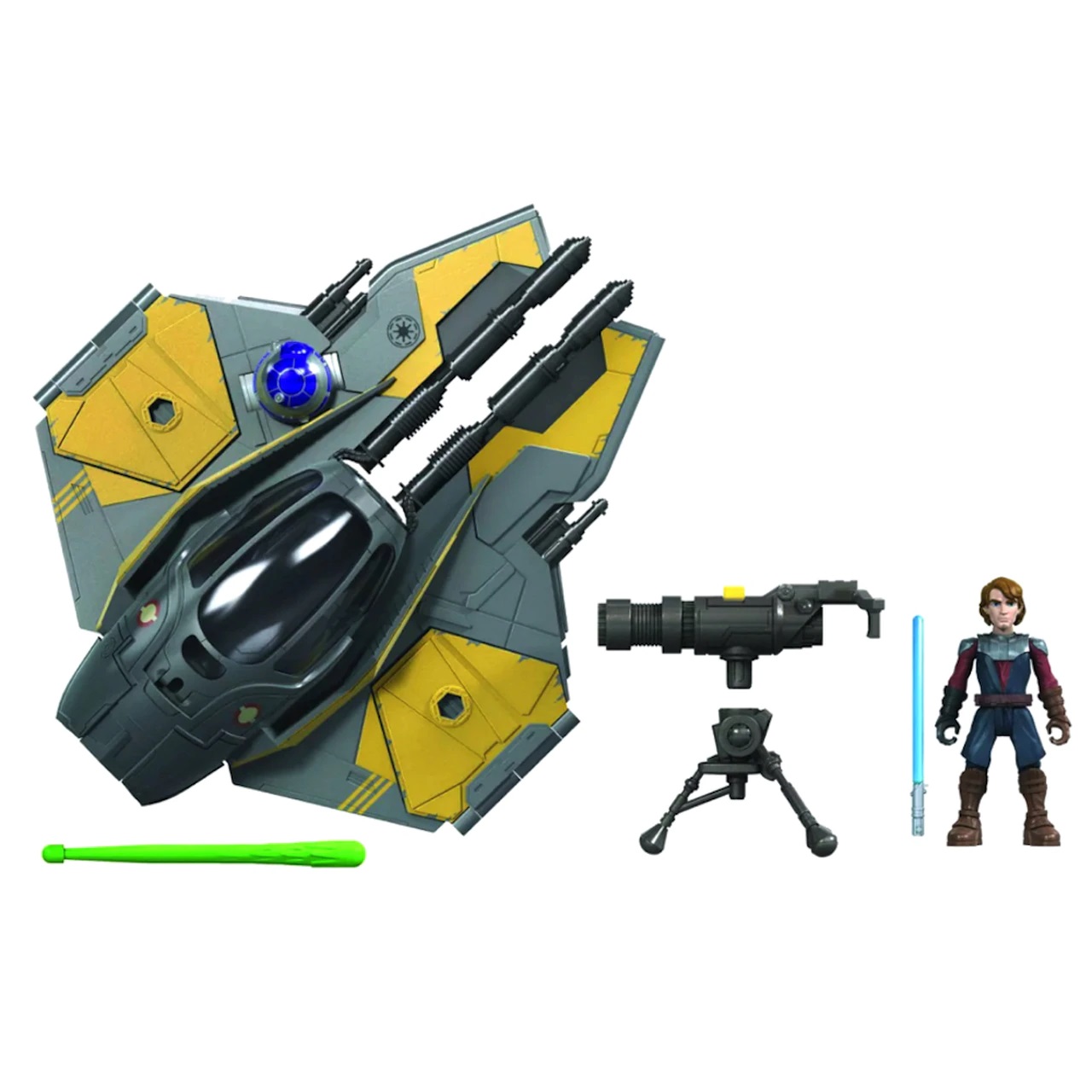 Anakin Skywalker uses the battle tested Jedi Starfighter as seen in Revenge of the Sith it's a Stellar Class designation; Anakin has a lightsaber of his and the Starfighter comes with working side guns; overall the vehicle captures the sleek design of the high period of the Grand Army of the Republic.