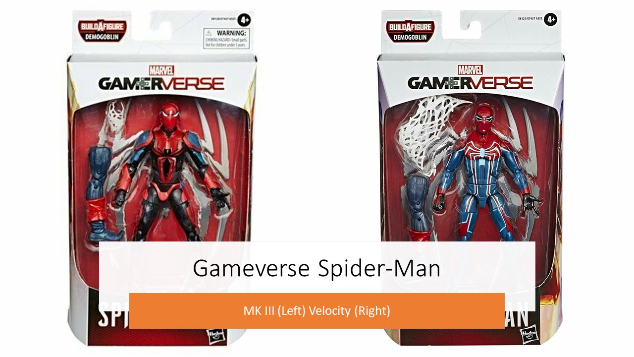 Along came a spider....A Spider-Man wave for 2020 featuring Demogoblin as the BAF Piece. This is some quality work from the Marvel Legend's Series and has a bit of wrinkle. The 2 Spider-Man in this series come packaged in White Gameverse boxes (see below) , that include Gameverse Velocity Spider-Man and my favorite of the wave Spider-Man Armor Mark III.