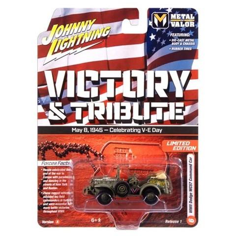 Celebrate American heritage and a pivotal moment in world history with this WWII Dodge WC57 Command Car VE Victory Europe Parade Vehicle diecast from Johnny Lightning. Finished in classic Army Green, this 1:64 scale model honors VE Day, marking Victory in Europe and the end of World War II combat operations across the European theater.