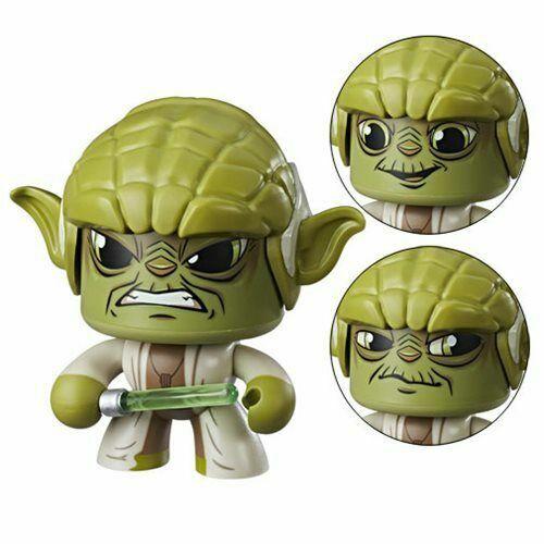 Star Wars Mighty Muggs are the classic collectible figure, and they're better than ever. Each figure is packaged in a stackable, sturdy box and is easily removed without damaging the packaging - just cut the tape, turn the fasteners, and it's free. And putting your figures back in the boxes for display is just as easy! Each 4" figure has 3 different faces; just push down on the top of their skulls and the figures can go from angry to happy to sad, or other emotions. You can even access the mechanism without having to open the packaging. In this series collect Darth Vader, Chewbacca, Yoda, Finn, and Poe Dameron